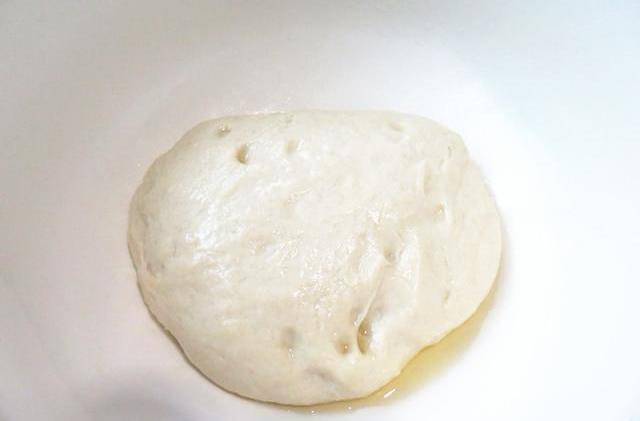 第一步,面粉中加入溫水,揉成光滑的面團,再倒上少許油蓋上蓋子醒一會兒;