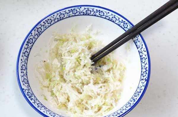 第三步,白蘿卜含水量多,醃制後會出些水分,用紗佈包住擠壓出水分,再倒入碗中,倒上10克的花生油、香油、五香粉、雞精拌勻醃制一會兒,餡料就調好瞭;