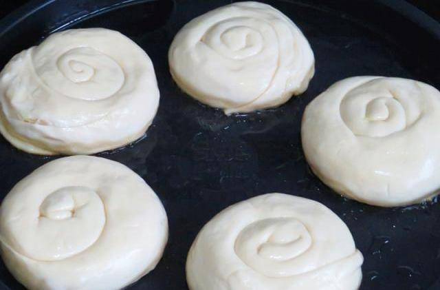 第九步,平底鍋中倒入剩餘的油,把小餅一個個擺放在裡面中小烙;