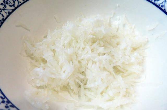 第二步,白蘿卜去掉根部洗幹凈表皮,再擦成細絲,倒入鹽拌勻醃制一會兒;
