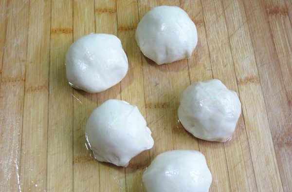 第四步,取出醒好的面團,搓成長條,再切成5個大小均勻的劑子,分明揉圓;