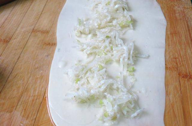 第六步,取適量的餡料放在面皮的中間部分;