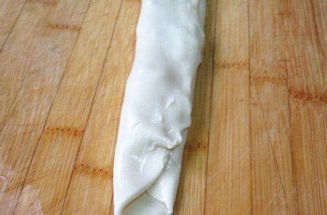 第五步,案板和搟面杖上分別抹上油,取一個劑子搟成長型的薄面皮;