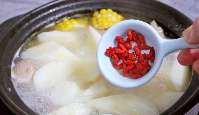4、再放入山藥,大火煮開後改小火繼續慢燉20分鐘,最後再加入枸杞和鹽,再燉5分鐘即可