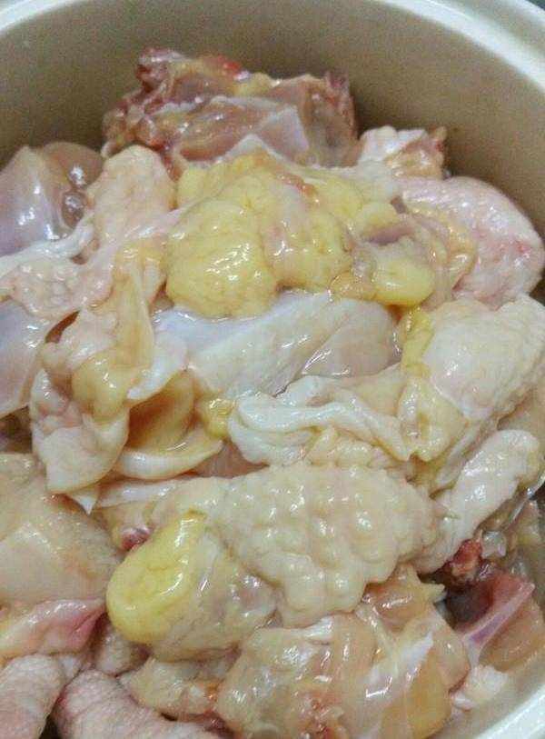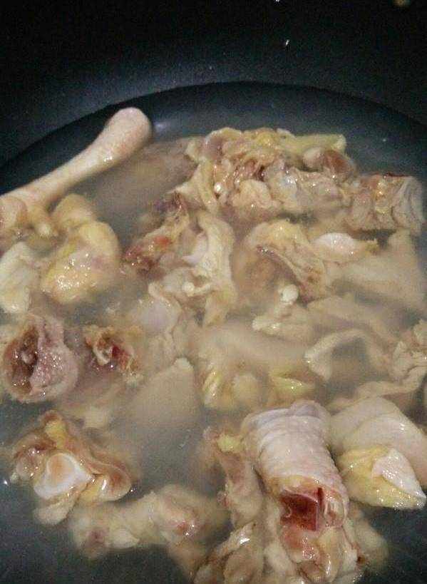 5.將適量的水倒入鍋中煮開,放入雞肉煮2分鐘後,撈出泡沫,用水洗凈,放入碗中。