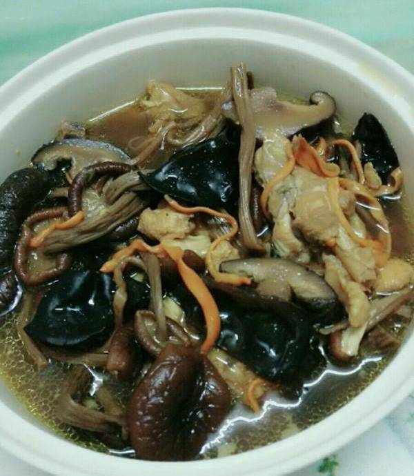 三黃雞500克、茶樹茸80克、精鹽2湯匙、蟲草11把、香菇(幹)8個、黑木耳(幹)12輪、生薑6張、桂皮1個、八角2個、香葉2張、料酒1湯匙