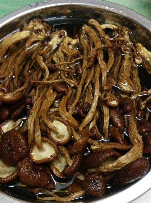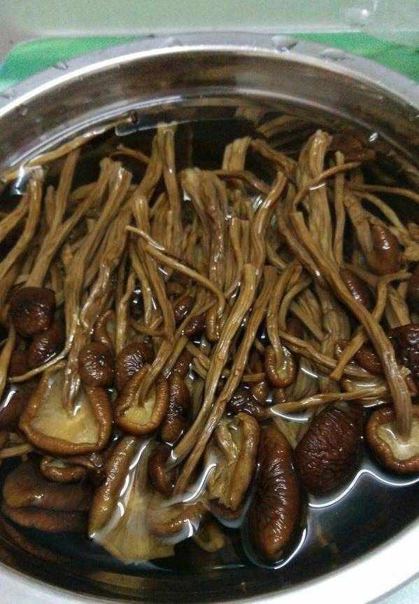 2.10分鐘後,倒水,把香菇放到節頭,洗凈,放入碗裡,再加適量水浸泡,預備。