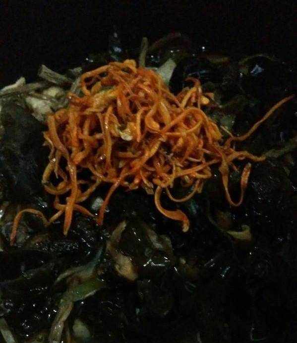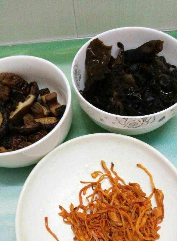 9.黑木耳用水洗凈,大輪撕成小輪,香菇片;把蟲子和草的花洗幹凈,我把那個分別放進碗裡。