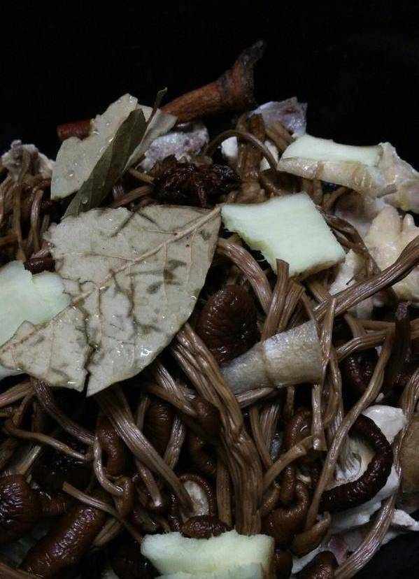 7.將雞肉和香菇放入鍋中,放入薑、香葉、八角、桂皮。