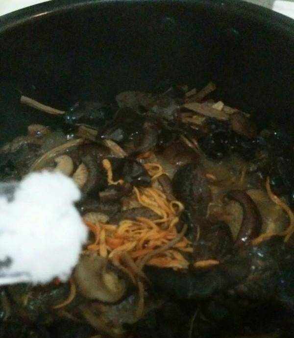 10.1小時後,打開鍋蓋,將蟲草花、香菇片、黑木耳一起放入鍋中,充分混合,蓋上鍋蓋繼續湯。