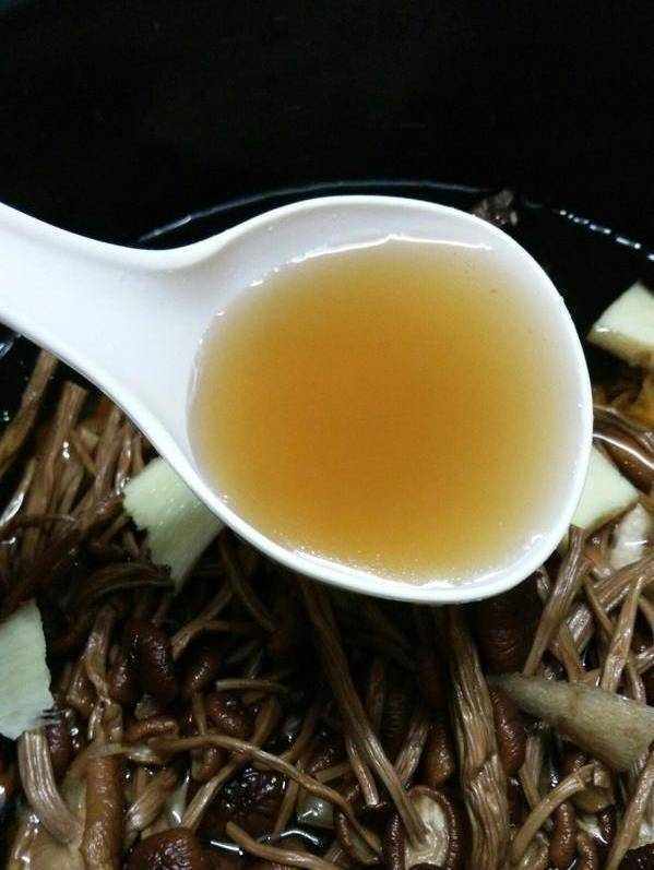 8.剛才沏茶的香菇水很香,不扔掉,放入鍋裡,再註入適量清水,加入料酒,蓋上鍋蓋,按湯鍵做一個半小時的湯。