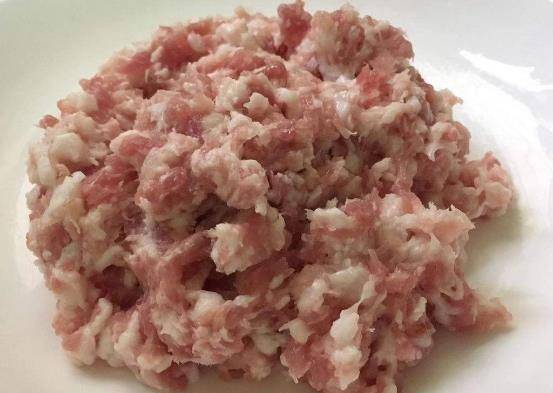 ③將過涼水之後的南瓜莖切碎備用。接下來清洗五花肉,將五花肉同樣切碎備用,可以直接放在打肉機當中。