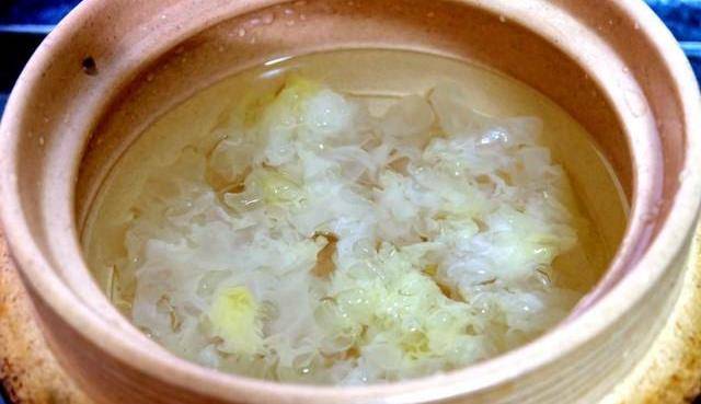 2、砂鍋裡裝上清水,把鮮銀耳去根,隻留葉片撕成小朵放到鍋裡。大火燒開,轉小火熬煮30分鐘;