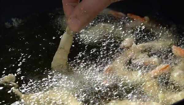 鍋中倒油,油燒至5成熱後把大蝦一個個地放入油中煎炸