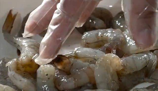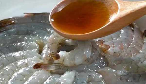 買回來的大蝦我們把其去掉外殼,然後把處理好的大蝦放入盤中,再加入一勺料酒,一小勺鹽和胡椒粉,把它們抓拌均勻,醃制一會兒
