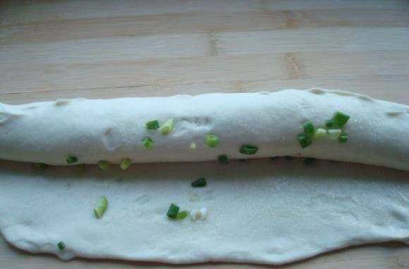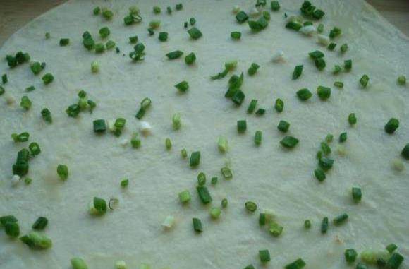 3、將面團搟成圓形,用勺子均勻的塗上一層臘豬油,撒上鹽,再撒上一層蔥花