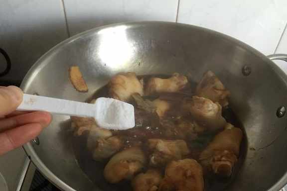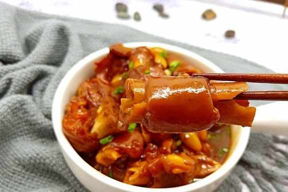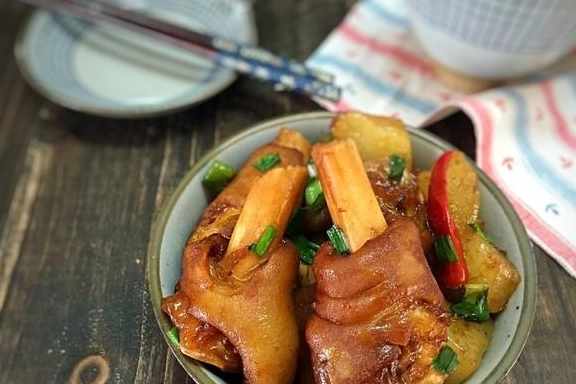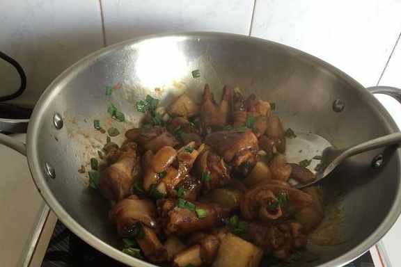 第八步:直到鍋中的湯汁收幹,白蘿蔔已經熟透了,羊蹄已經非常軟爛了,就可以關火了,出鍋前將切好的蔥花撒在上面就可以了。