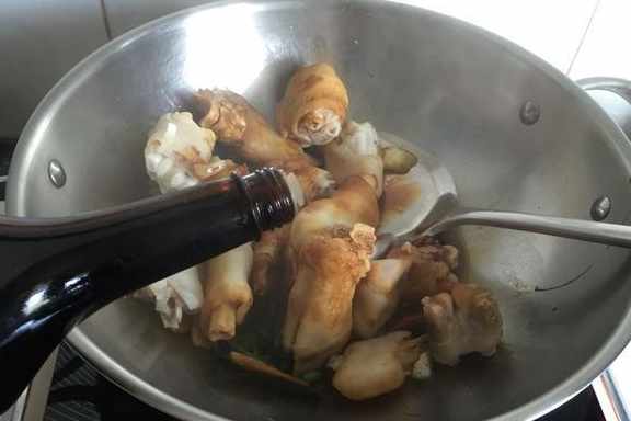 第三步:再把焯好的羊蹄放入鍋中,加入生抽、醬油和料酒翻炒均勻。