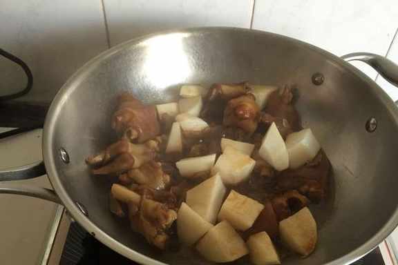 第七步:壓力鍋中的羊蹄已經差不多熟透了,將羊蹄拿出來放入燉鍋中,再將切好的白蘿蔔放入鍋中,嘗一下味道,適當加鹽。