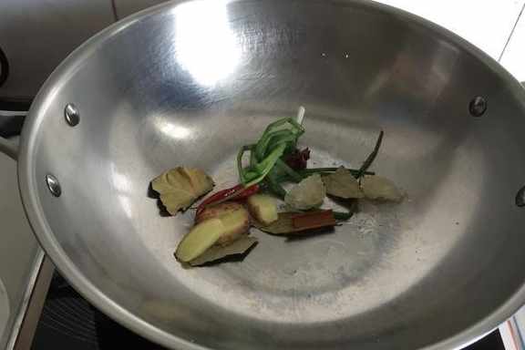 第二步:鍋中加入適量的食用油,然後加入八角、桂皮、香葉、幹辣椒、冰糖和葱薑大火爆炒出香味。