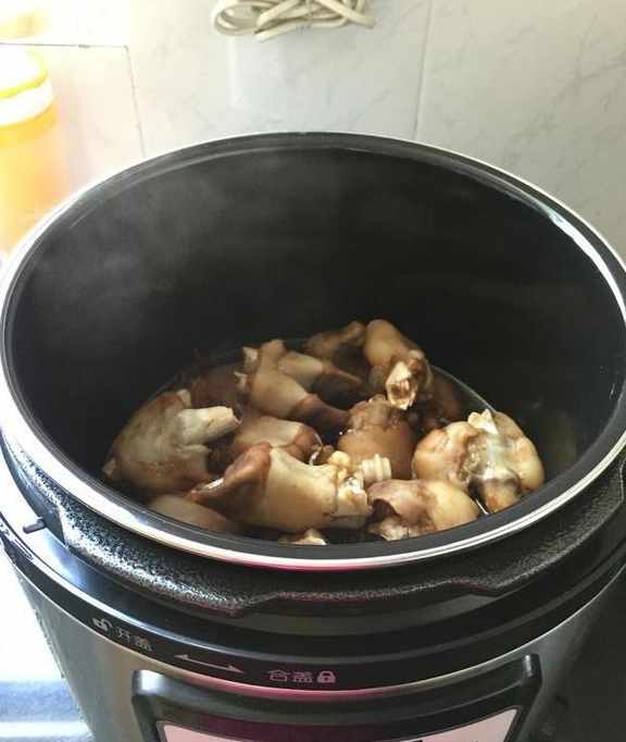 第五步:然後把蒸鍋羊蹄和湯汁放入壓力鍋中,大約壓20分鐘。