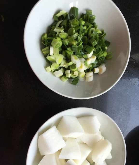 第六步:白蘿蔔切成小塊,葱切成蔥花備用。