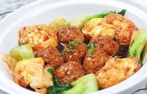 4、鍋下高湯燒開,下入獅子頭、炸雞蛋,調味後小火燒制至入味,勾薄欠出鍋,擺入上海青,撒上蔥花即可。