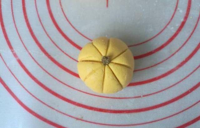 4、糯米面團壓扁,包入豆沙餡。收口、揉圓。壓出南瓜形狀,中央放一粒葡萄幹,作為南瓜蒂。