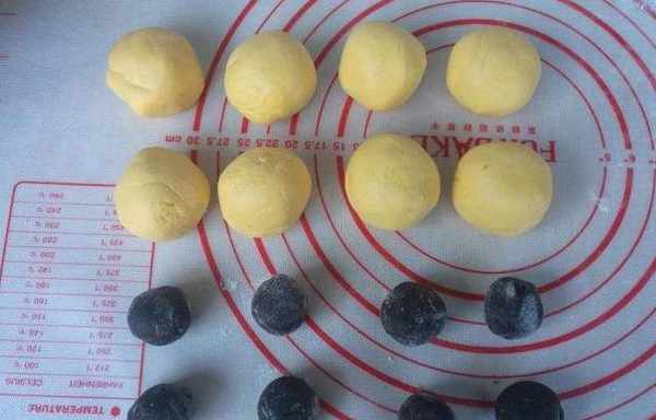 3、將豆沙餡分成15克左右的的小劑子,面團分成50克左右的小劑子。