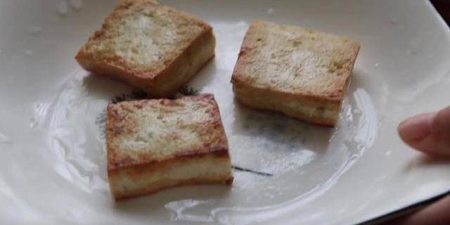 4.接著拿出來一塊新鮮的豆腐出來,把豆腐切成薄厚均勻的豆腐片,全部切好之後把豆腐片放入盤子裡面。平底鍋預熱,倒入食用油進去,油熱放入切好的豆腐塊進去煎一下,把豆腐塊的兩面都煎至金黃,然後撈出來。