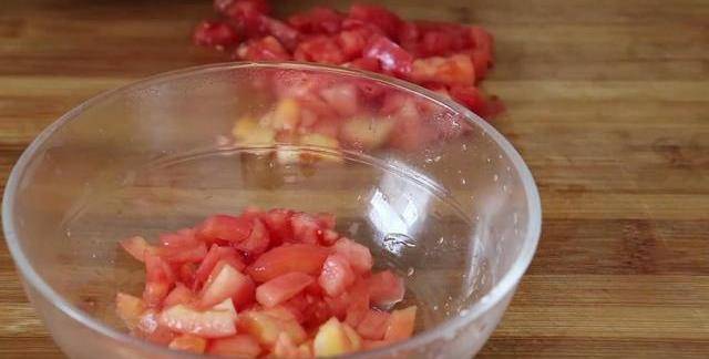 2.白蘿卜片切好瞭之後將其疊放起來,切成大小相等的小塊,全部切好之後放入盤子裡面待用就可以瞭。這個時候我們浸泡的番茄也已經浸泡好瞭,用手剝掉番茄的番茄,切掉番茄的根部,把番茄切成大小相等的碎丁。