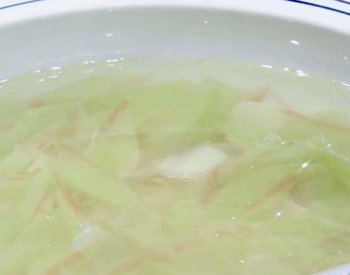 食材準備:西瓜皮、鮮百合、雞胸肉、蔥、薑、香油、鹽、味精等;