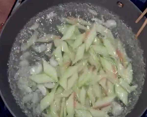 2、 鍋上火,加適量清水燒開,下入改刀後的瓜皮、洗凈的百合焯水,至食材成熟時調成小火(不關火),將瓜皮與百合一同撈出,過涼、控水後放入湯盆中待用;