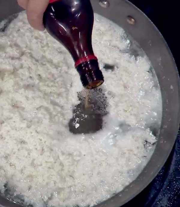 5、 鍋內加入少許花雕酒、白胡椒粉,開鍋後2-3略煮分鐘;用密漏輕輕打去浮沫;