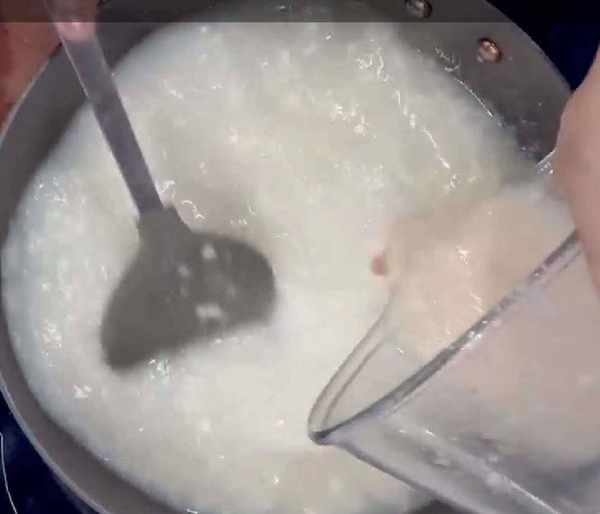 4、 將焯燙百合、瓜皮留下的湯燒開,邊攪拌邊倒入稀釋後的雞蓉;攪勻後轉小火慢慢燒開(這一步是制作清湯的關鍵,一定要用小火慢慢煮開);