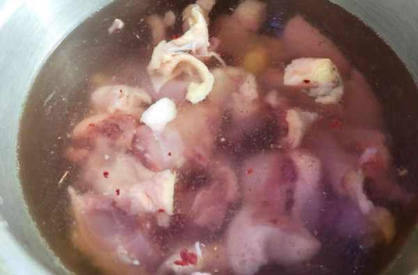 2.雞肉冷水下鍋焯水,加點料酒去腥,煮開後,有大量的浮沫浮出,可以把浮沫給撈出,再把焯水好的雞肉撈出過冷水清洗一下。