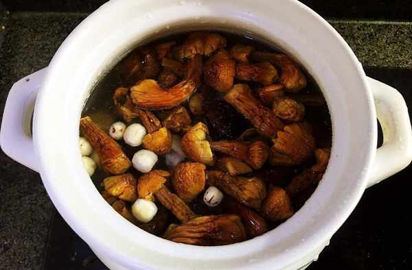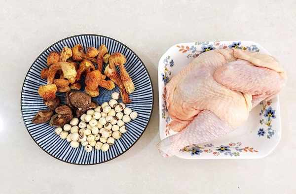 食材:雞肉 半隻,姬松茸,香菇(看個人喜好來放,可不放),蓮子 100克,薑 2片,幹蜜棗 1個,鹽 適量