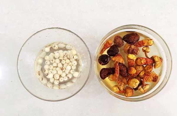 1.首先把姬松茸,香菇,蓮子用清水浸泡30分鐘。姬松茸泡水之後,清洗幹凈,蒂頭的位置有時候有沙,所以清洗的時候,捏一下,洗幹凈;姬松茸有提高免疫力的作用哦,傢裡有孩子,多煮一些菌菇類的湯對身體特別的好!蓮子記得把中心的芯給去掉,如果是買到的姬松茸比較大,也可以把它切成兩半哦)。