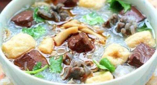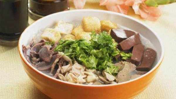 期間把放置一旁的粉絲,放入水中泡發備用;把煮好的鴨胗撈出切片,熟鴨腸切成一段一段,油豆腐切成三角形,把鴨湯盛入砂鍋中,加入鴨血和油豆腐,放入適量的鹽和胡椒粉煮上8分鐘;8分鐘後加入粉絲,把粉絲煮成透明狀加入雞精關火,把湯盛入碗中,放上鴨胗、鴨腸,可根據自己的口味加入香菜和油辣椒即可食用