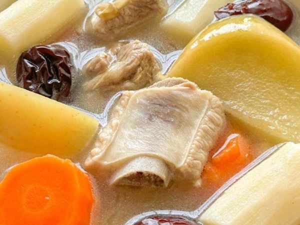 3、將排骨、薑片、胡蘿卜放入湯鍋中,加入足量的清水,蓋上蓋子燉煮半個小時。接著再放入山藥、紅棗、蘋果繼續煮半個小時。
