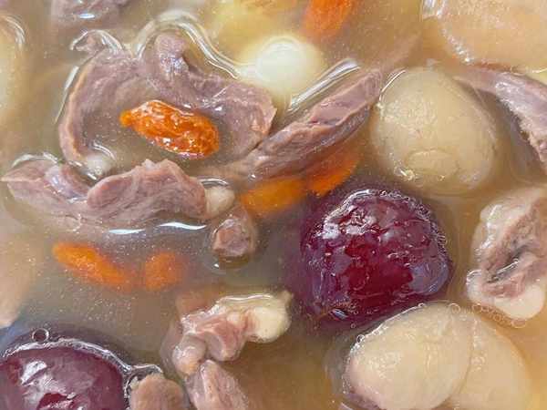 2、豬心冷水下鍋焯水,加入薑片去腥,煮開後撇掉浮沫,再撈起來瀝幹水分放入湯鍋中,再將紅棗、黃芪、蓮子、桂圓肉全部放入湯鍋中,加入足量的清水,蓋上蓋子燉煮1.5個小時。