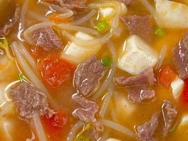 1、牛肉清洗幹凈切成片,加入薑片、紅薯、淀粉、食鹽、蔥薑水,攪拌均勻醃制十分鐘。番茄削掉外皮,清洗幹凈切成片。嫩豆腐切成小塊,綠豆芽清洗幹凈即可。