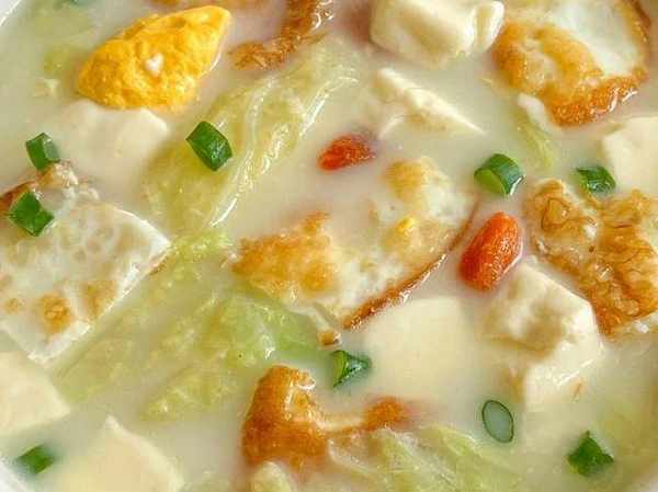 3、水燒開後放入嫩豆腐煮3分鐘左右,煮至湯水濃白,再放入白菜煮熟,最後加入適量的食鹽調味,撒上枸杞子即可出鍋開吃。
