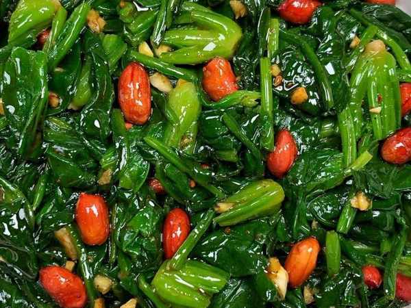 3、花生米放入油鍋中炸一下,炸香之後撈起來放入菠菜中,再倒入醬汁攪拌均勻即可上桌開吃。