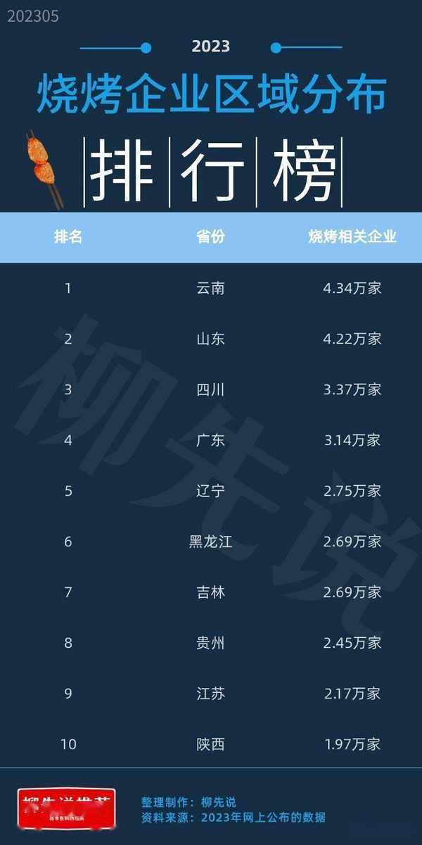 燒烤企業區域分佈排行榜第3名是四川,燒烤相關企業數量為3.37萬傢。古蜀文明發祥地,地形復雜多樣。四川燒烤形式同樣多樣,有宜賓的把把燒,西昌的火盆烤,石棉的鐵板燒以及樂山峨眉的百變串串,在成都還能找到各種網紅燒烤;燒烤企業區域分佈排行榜第2名是山東,燒烤相關企業數量為4.22萬傢。最初作為一個地理概念,主要指崤山、華山或太行山以東的黃河流域廣大地區。烤爐一架,小餅一卷,“淄博燒烤”在今年成功出圈,已然成為瞭淄博的新名片。山東其他“門派”的燒烤有濟南燒烤、青島燒烤、煙臺燒烤以及威海燒烤。