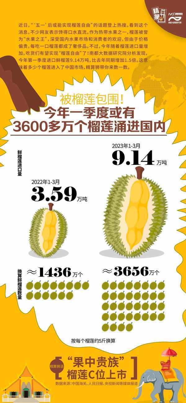 近日,“‘五一’後或能實現榴蓮自由”的話題登上熱搜。看到這個消息,不少網友表示饞得口水直流。作為熱帶水果之一,榴蓮被譽為“水果之王”,深受國內水果市場和消費者的歡迎,但由於價格偏貴,榴蓮成瞭奢侈品。不過,今年隨著榴蓮進口量增加,吃貨們有望實現“榴蓮自由”瞭!南都大數據研究院分析發現,今年第一季度進口鮮榴蓮9.14萬噸,比去年同期增加1.5倍。這意味著有多少個榴蓮進入瞭中國市場,精算獅帶你來數一數。