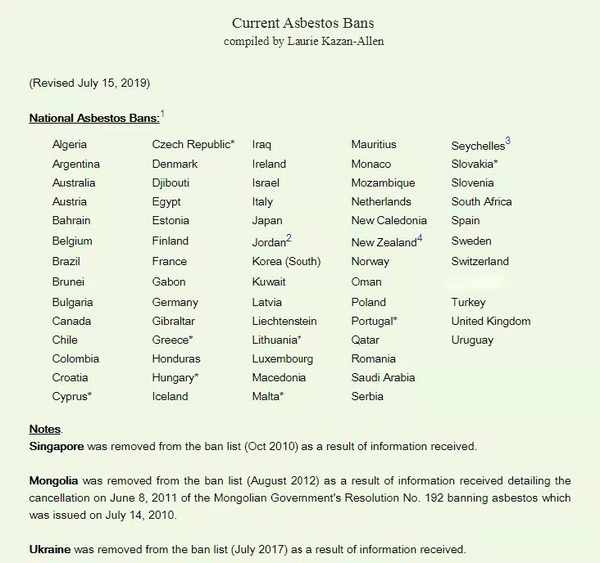 截至2019年7月,全球已有66個國家和地區禁止使用石棉。但在开发中国家,由於經濟發展等原因,石棉仍被廣泛使用。