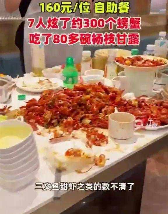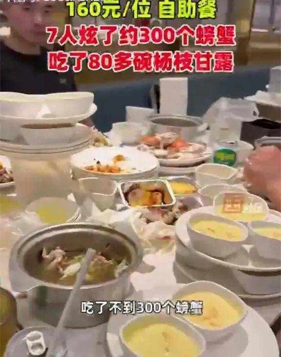 不過,大傢都去擼串的同時,也有不少人走進瞭自助餐店鋪。提到自助餐,就讓人想到瞭那句口號:吃自助餐的最高境界——扶墻進扶墻出。這不,最近就有網友爆料,山東張先生一行7人,在160元/位的自助餐廳,炫瞭300多個梭子蟹,80多碗荔枝幹露,我的個乖乖,真是給老板上瞭一課啊。這量也太大瞭吧,平均每人50多隻梭子蟹,10碗荔枝幹露啊,這真的是肯定要扶墻出啊。