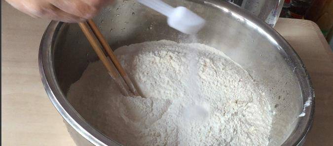 四百克面粉,加兩克鹽,增加面的筋性,餃子皮不破,有彈性,溫水和面,攪至絮狀,揉成光滑的面團