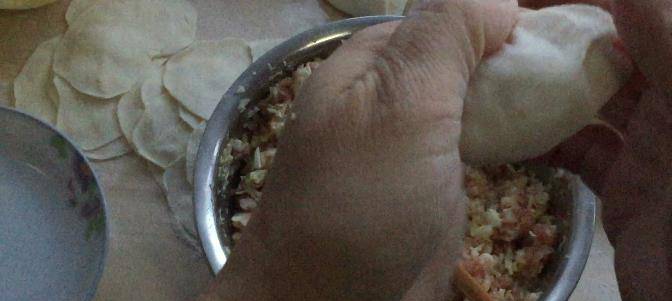 肉餡放入餃子皮上,對邊一捏,放在左手大拇指與食指之間,右手大拇指與左手大拇指往中間一擠,餃子就包好瞭
